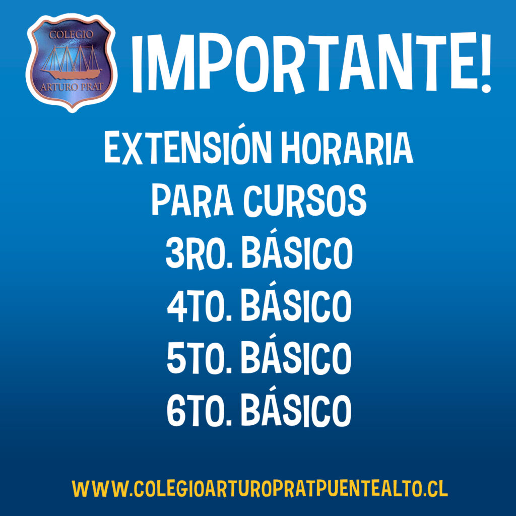 Señor Apoderado(a): Comunico a usted que, bajo el marco de nuestro Proyecto de Mejoramiento Educativo, el Plan Anual de Estudios aumenta la cantidad de horas de asignatura en los niveles de 3° a 6° Básico. El cumplimiento de esta extensión es de carácter obligatorio, ya que forma parte del currículum de nuestro establecimiento. Este ajuste implica que los estudiantes de estos niveles entrarán a las 11:30 horas según el siguiente calendario: