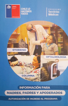 5.- Apoyo con el programa de salud escolar: El objetivo del programa es resolver problemas de salud vinculados al rendimiento escolar, tales como: problemas de visión, audición y columna; con el propósito de mejorar la calidad de vida de nuestros beneficiarios a través de acciones clínicas y preventivas que contribuyan a su mantención en el sistema escolar. Para ello es requisito que usted firme el consentimiento informado y complete la encuesta que se le entregará.